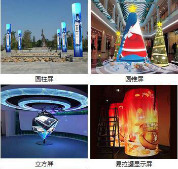 現已有LED企業專門研發了三角形、梯形、圓形、平行四邊形等各種異形模組,可以拼合成波浪屏、扇形屏、弧形屏、圓形屏、圓錐屏、球形屏、菱形屏、鉆石屏等各種形狀,規則或不規則的幾何圖形LED顯示屏。